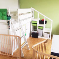 Das quer gelegte Regal teilt den Raum in eine Spiel- und eine Ruhezone in der gemalt, gelesen und geschlafen wird.